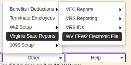 - WV does have a separate efile W2 report that can be found in the payroll module under Other