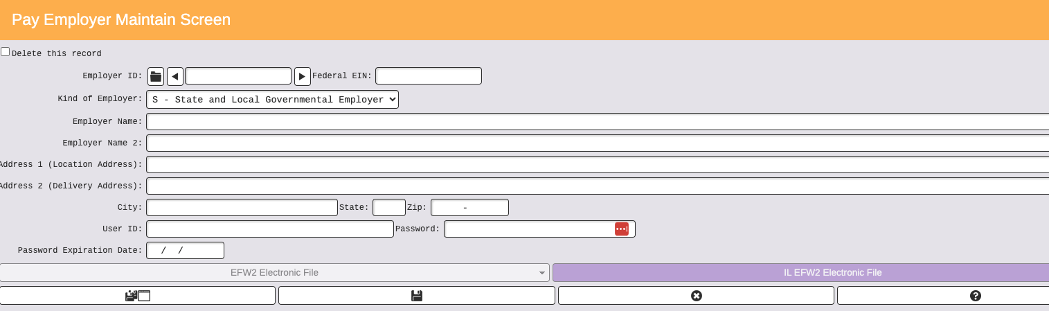 - Employer ID– select the appropriate ID; fields on the screen default based on information in the Payroll Setup → Employer Master