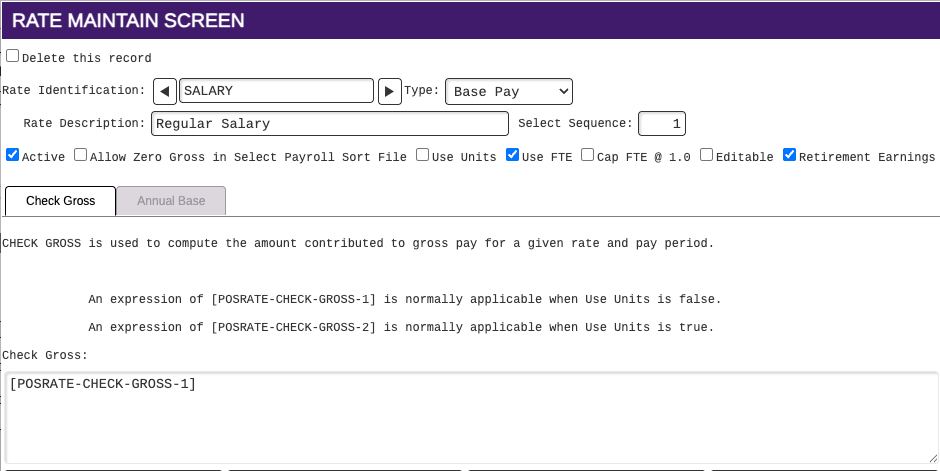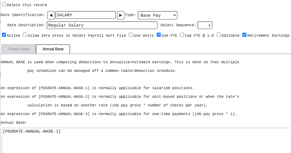 2. Check Gross and Annual Base tabs - If the new rate was added by using an existing rate (recommended), these two tabs will be populated. Ensure that the Check Gross field is correct per the expression information provided whether the rate is paid by units (Use Units is true), or not paid by units (Use Units is false).