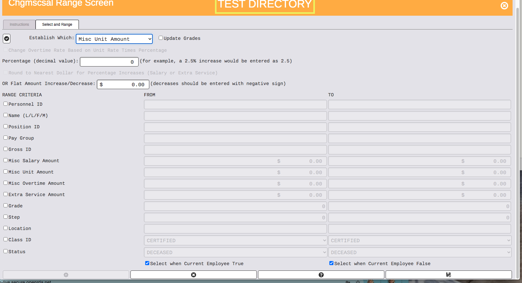 On the next screen, select the type of pay unit (generally Misc Unit Amount is used), indicate whether you want to increase the current rate unit by a percentage or by a specific dollar amount, and range on the necessary fields to select only those employees you want to change rates. This may take one or two different ranges to select all the employees who require adjustment.