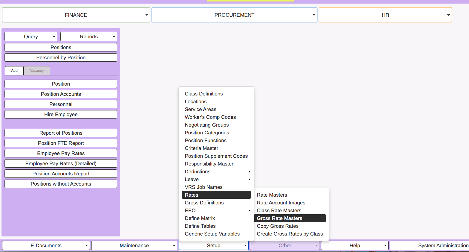 If the employees' pay rates are stored in the Gross Rate Masters, go to the Position Tracking → Setup → Rates → Gross Rate Masters.