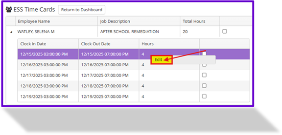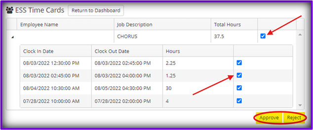 Approvers can VIEW/APPROVE/REJECT/EDIT Time Cards/Time Sheets in Approve Time Card from the Dashboard.