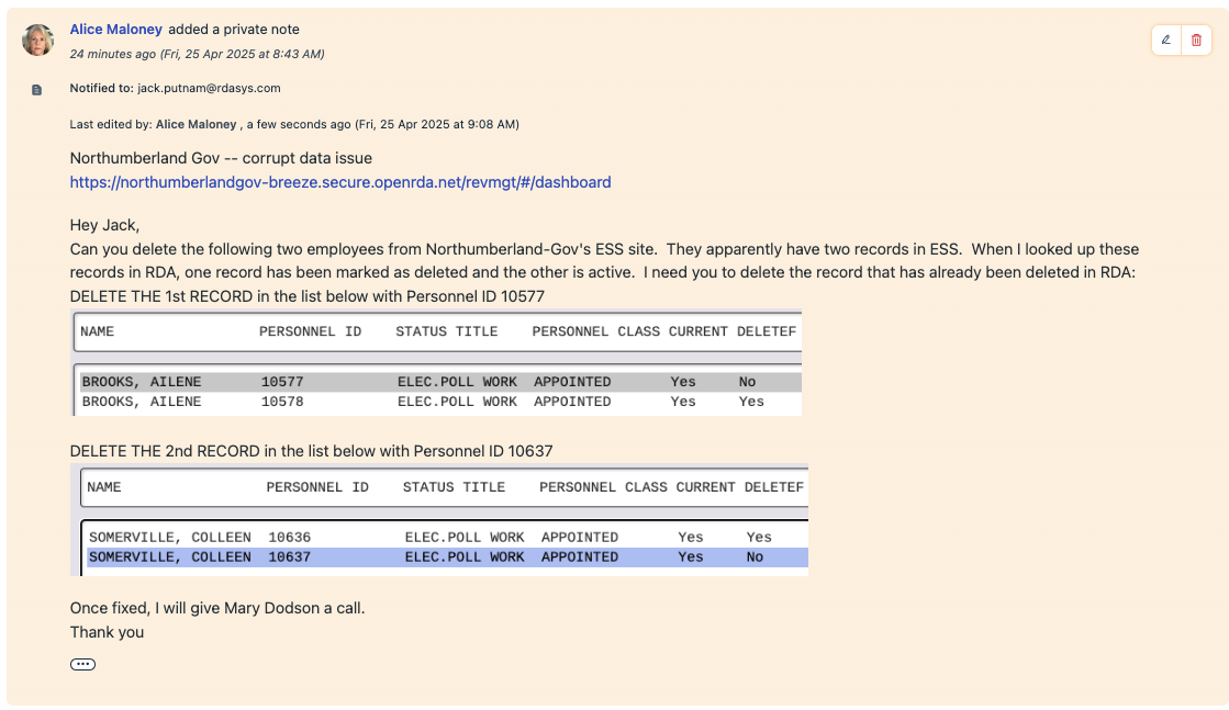 You will need to go to RDA Personnel Demographics and find these records. If there are two records, you will need to tell Jack which record needs to be deleted and which records needs to stay in ESS.