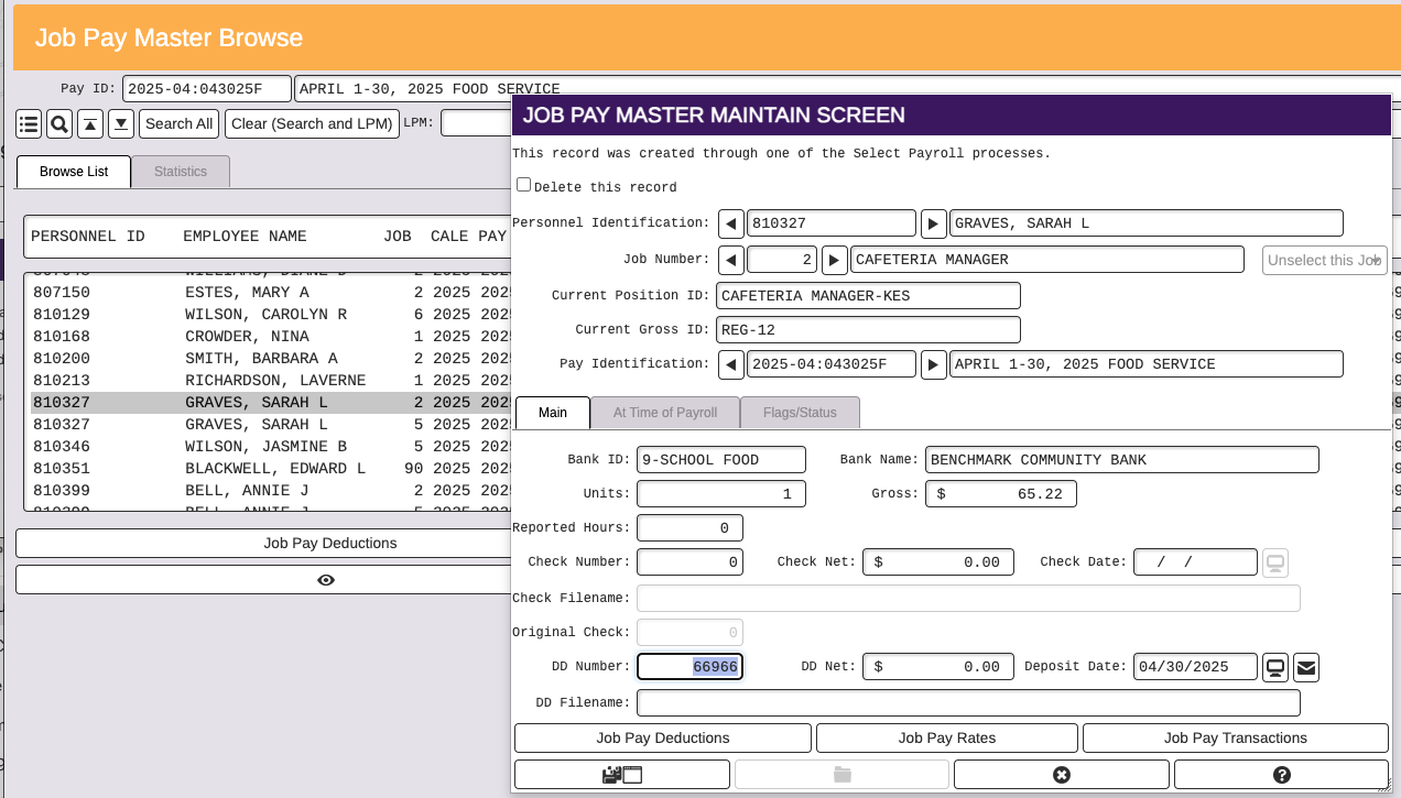 SOLUTION: Go to the Payroll ID menu and select Job Pay - Jobs. On the Browse screen, find the employee that is missing a DD number and add the DD number and the DD date to the screen and save it. The client cannot do this. It can only be done by someone logged in as rdacron.