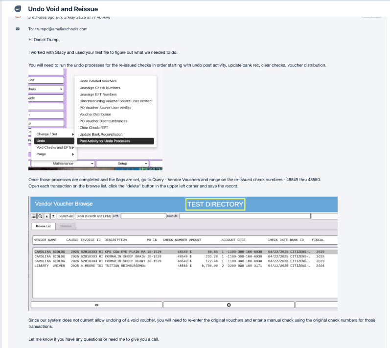 ISSUE: Client re-issued 2 vendor vouchers in procurement and then found out that the original 2 checks issues were actually cashed by the vendor. Now the re-issued checks need to be deleted and the original 2 checks need to be re-activated. Currently RDA Procurement does not have an undo re-issue process or an undo void voucher process.