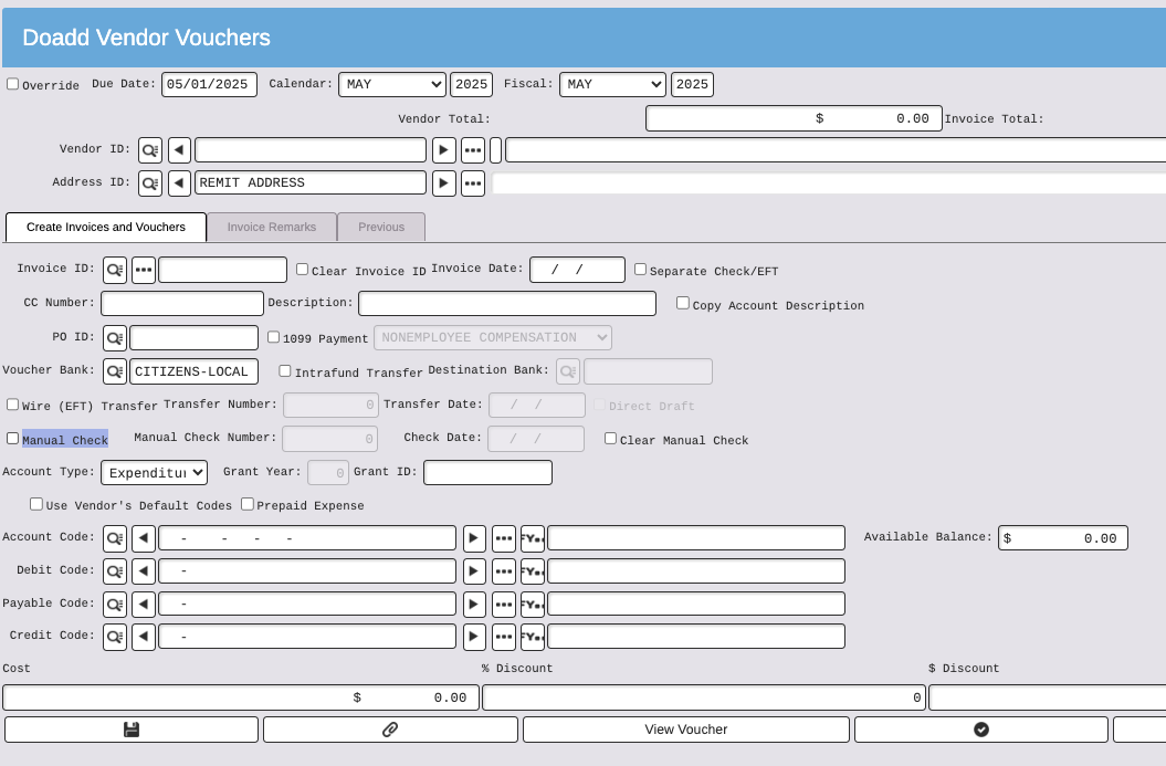 To issue the manual check, use the normal add voucher process and check the box that indicates "manual check".