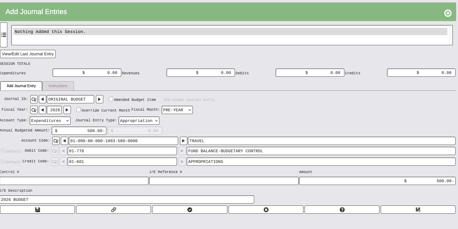 - Journal Entry Type, either Appropriation for expenditure, or Estimated Revenue for revenue