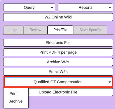 A report titled Qualified OT Compensation is located under HR / Workforce → Payroll W2 Processing → Left task menu Print/File tab. This report will provide a page break option to separate by employee. An archive option is available to archive this report per employee in Personnel Documents. This document can be uploaded to ESS using the Document Type QUAL OT COMP. Enter Calendar Year on the Resources tab.