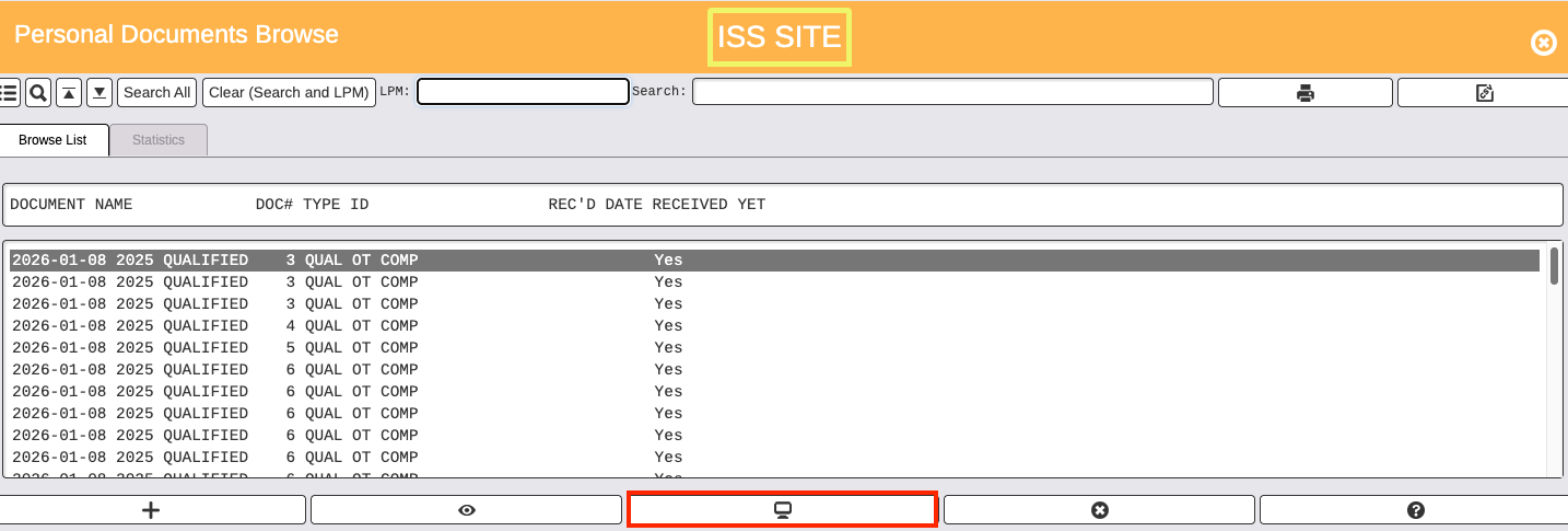 When viewing the Personnel Documents Browse, the monitor icon at the bottom can be used to view the report.