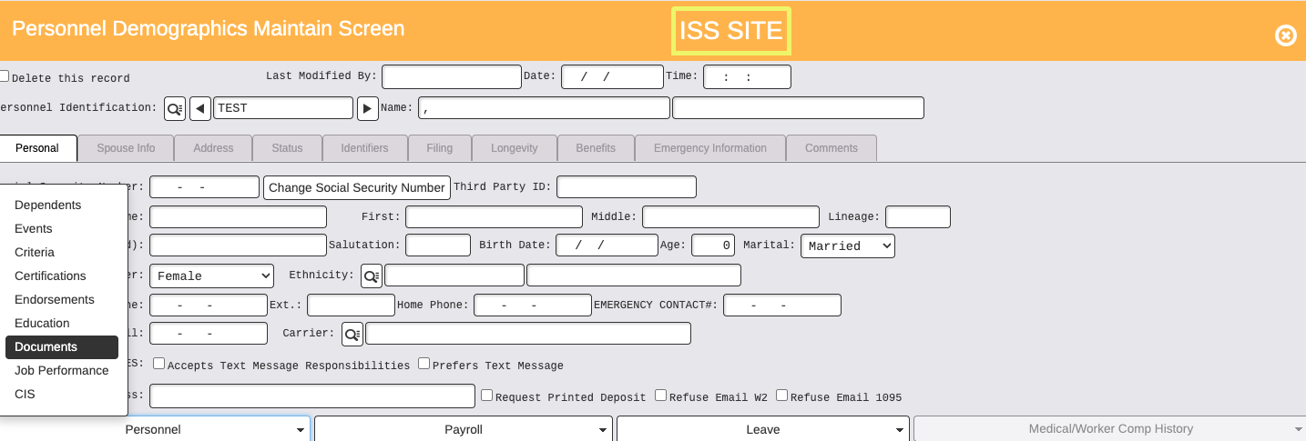 Personnel Documents can also be accessed from Personnel Demographics → Personnel tab at the bottom → Documents.