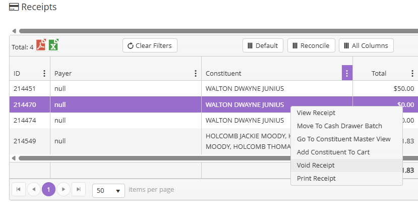 - Right click the receipt item to View Receipt and confirm that is what is needed to be voided, then go back and click on Void Receipt