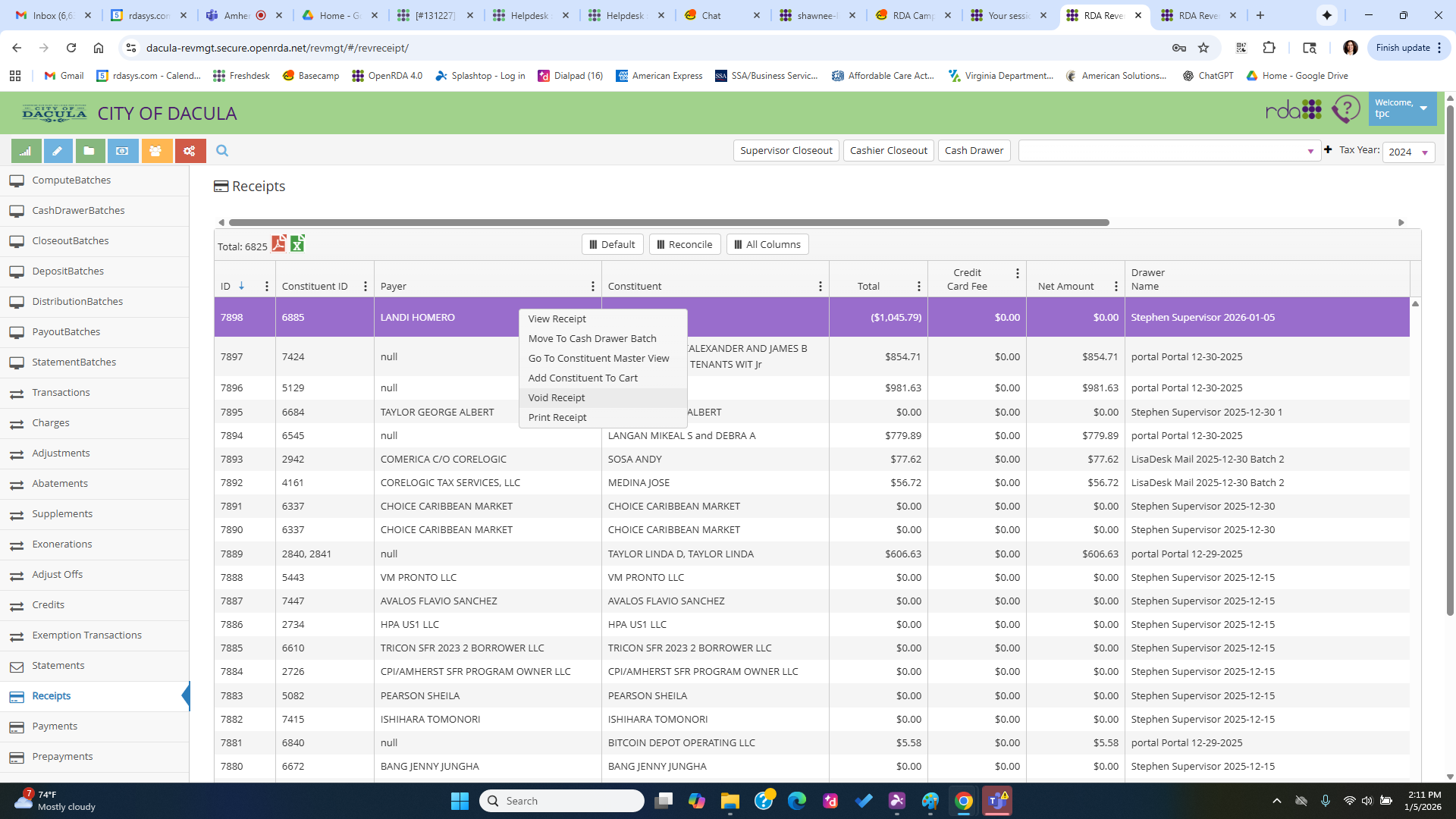 - Run the Supervisor batch through Cashier Closeout and Supervisor Closeout, which will create the negative Deposit and Accounting to back out the Receipt entirely.
