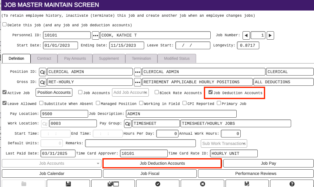 One job master is selected, click on the box titled Job Deduction Accounts and click Save at the bottom of the Job Master. This will enable the Job Deduction Accounts button.