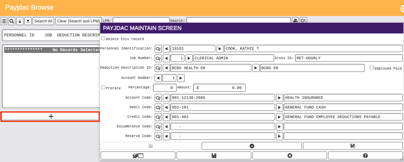 - If there will be multiple Job Deduction Accounts for one deduction that need to be prorated, select the Prorate box and add the percentage for the first account. The last job account entered should NOT have the Prorate box checked and there should be no percentage or amount entered.