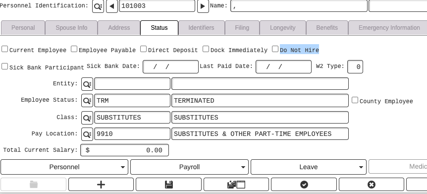 The DO NOT HIRE flag will grey out the employee status and will unflag current employee and employee payable.