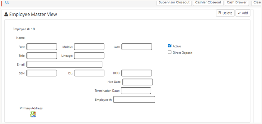 - Select Add+, which pulls up a blank Employee Master View